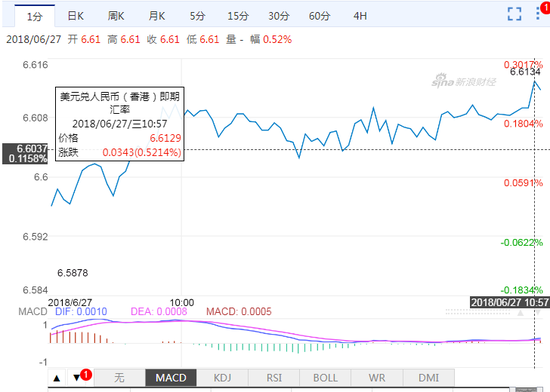 新浪财经讯 6月27日,在岸、离岸人民币(6.5940, 0.0172, 0.26%)双双跌破6.61关口。离岸人民币现报6.6140,在岸人民币追随离岸跌势,报6.6128。